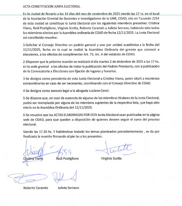 Dicha junta quedó conformada a partir de la votación en la Asamblea Ordinaria de COAD realizada el 12 de noviembre en el Salón de Actos de la Facultad de Cs. Exactas, Ingeniería y Agrimensura.